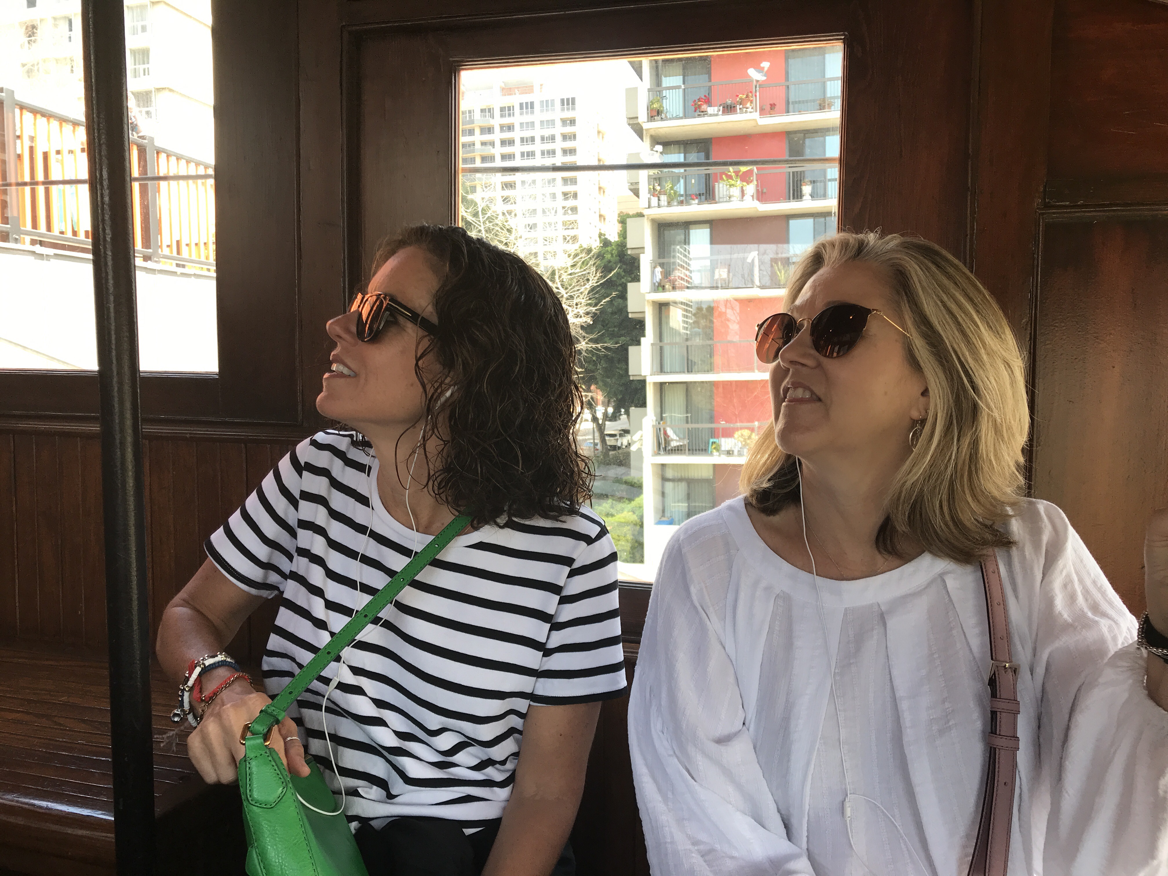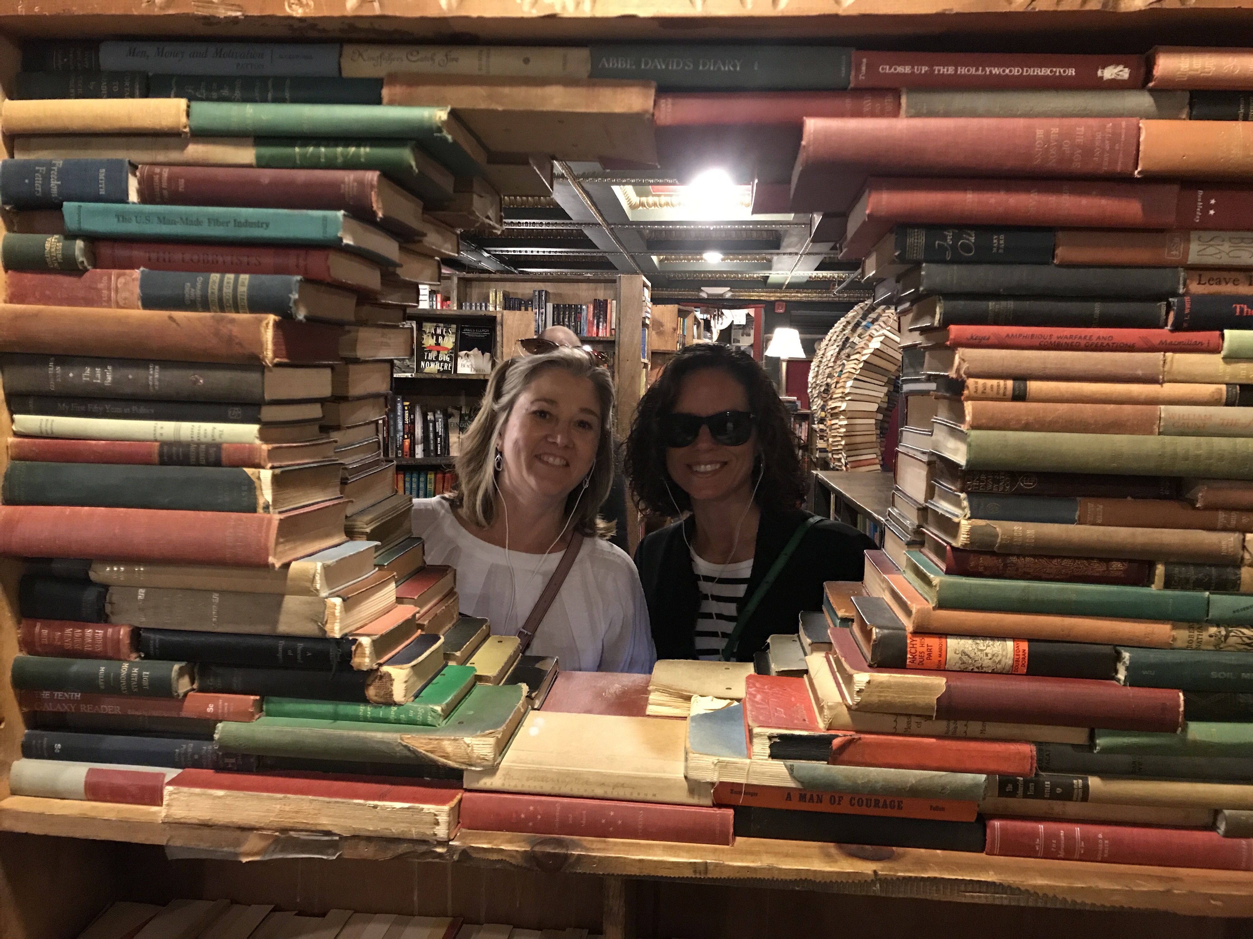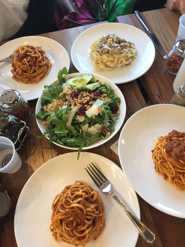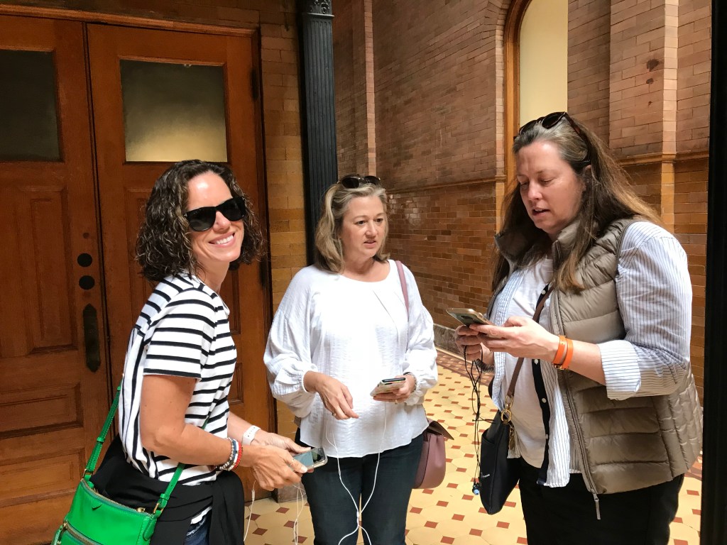 Our favorite walking tour app announced that it had been sold to Bose. The only good news about this announcement was that all audio tours were now free to download. Over breakfast one day we all downloaded three different walking tours. On this day we took the Historic Bank Tour in DTLA. The Detour app is/was location aware – so we started our tour and then paused halfway through so we could eat breakfast. Setting up the tour so we could all be synced posed some challenges. Gaia and Kate worked as a pair!